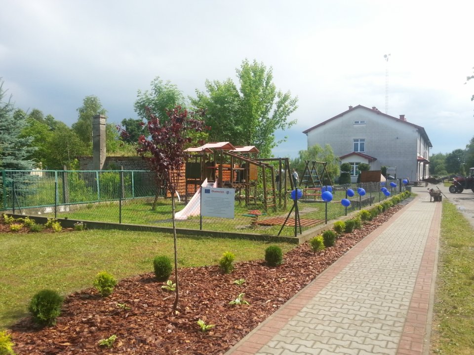 Poprawa warunków funkcjonowania otoczenia Szkoły Podstawowej w Augustówce poprzez urządzenie i wyposażenie ogólnodostępnego placu zabaw oraz utwardzenie placu apelowego kostką betonową.